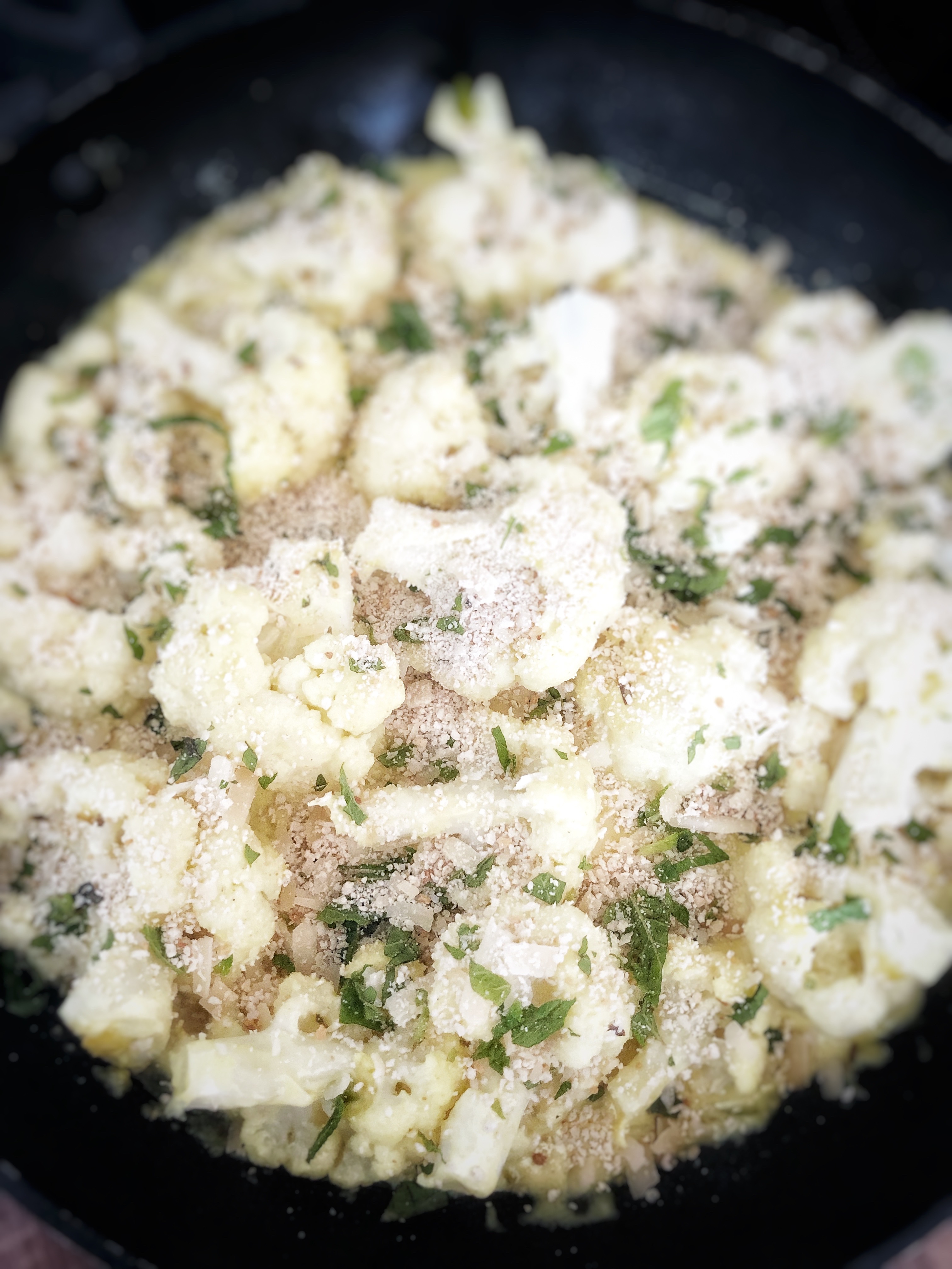 Karfiol ist für mich ein Gemüse welches ich über die Massen liebe. Zubereiten kann ich es allerdings immer nur wenn ich alleine zu Hause bin, denn meine Familie ist keine so großer Fan davon. Umso mehr zelebriere ich dann diese Karfiolpfanne ganz für mich allein. Diese Kombination lässt sich in angegebener Menge perfekt als Beilage für vier Personen zubereiten oder als Hauptgericht für zwei Personen! Eine weitere Besonderheit dieser Pfanne sind die Gewürze Kreuzkümmel, Kurkuma, Senfsamen und Chili! Ich mag es einfach nur Salat dazu zu essen. Den grünen Salat kombiniere ich dann mit hauchdünn geschnittenen Bio-Zitronenscheiben und gebe ein Dressing aus Calamansiessig und Orangenöl darüber! Die Pfanne stelle ich mir dann am Tisch und esse immer direkt daraus. Vielleicht ist es Einbildung – es schmeckt aber einfach besser so! Ein absolutes Lieblingsessen von mir!