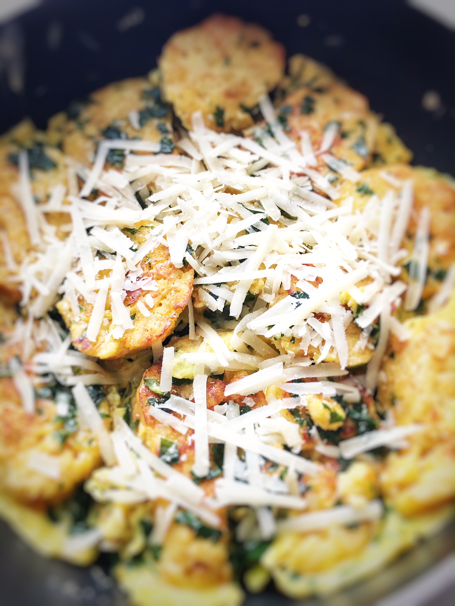 Ich serviere die Ei-Serviettenknödel gerne in der Pfanne und bestreue sie zuvor mit Parmesan. So bleibt alles länger warm und jeder entnimmt sich am Tisch so viel er möchte.