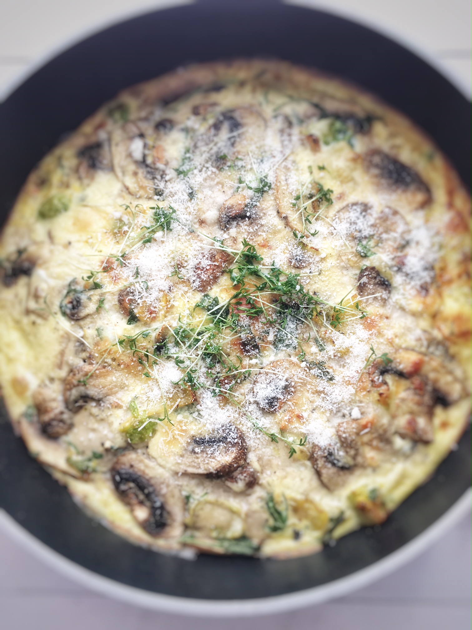Für die Frittata die Zwiebel schälen und fein hacken. Die Kartoffeln schälen und in sehr feine Scheiben schneiden. Die Kohlsprossen putzen (Strunk und die äußeren Blätter entfernen) und vierteln. Die Pilze waschen und fein blättrig schneiden. Den Rucola waschen und hacken.
